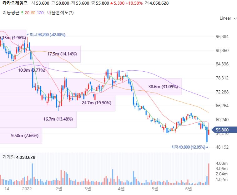 카카오게임즈는 모바일게임의 경우 퍼즐, 슈팅과 같은 캐주얼 게임부터 MMORPG 같은 하드코어 게임까지 다양한 장르의 게임을 서비스를 진행하는 회사입니다. 카카오게임즈의 대표작으로는 오딘이 있으며 꾸준히 상위권을 유지중이며 최근 신작 우마무스메 프리티 더비를 출시했습니다. 증권가에 따르면 현재 추세로 초기 일매출 30억정도로 판단되는데 처음 예상했던 일5~10억보다는 훨씬 상회하는 효과를 나타나며 우마무스메 수익 수혜가 예상되며 외인수급이 대량 들어오며 좋았습니다.