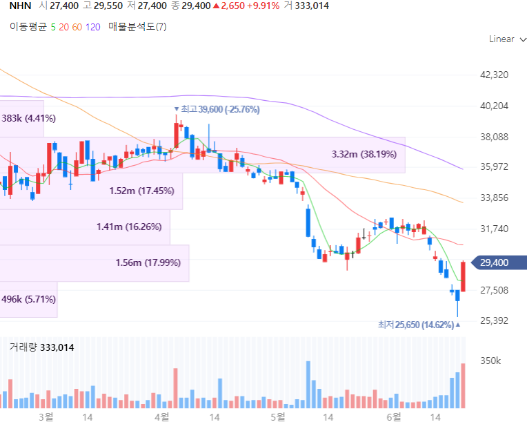 NHN은 네이버의 게임사업 부문을 인적분할하여 설립됐으며 현재 온라인 및 모바일게임 사업과 간편결제 서비스 및 웹툰 서비스 등을 운영합니다. NHN은 주가 안정을 도모하고 주주가치를 제고하기 위해 21일부터 신규 자사주 매입에 나서며 전일 종가 기준 300억원어치인 110만주를 장내에서 취득하며 아울러 자사주는 6개월 내 처분할 계획이 없다고도 명시했습니다. 동산느 크루세이더퀘스트, 킹덤스토리 등의 RPG 등 다양한 장르의 게임을 출시했으며 매출구성은 결제및광고 약42.18%, 기타 약32.49%, 게임 약25.33%로 나타납니다.