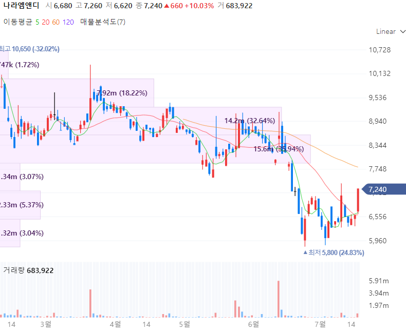 나라엠앤디는 LG전자 생산기술센터 금형공장을 스핀오프 방식으로 분할하여 설립된 금형 전문 업체로 금형 제작 사업과 함께 금형을 이용한 자동차, 가전부품 양산 사업도 영위합니다. 나라엠앤디는 LG화학 배터리팩 최대 공급사로 알려지며 2차전지 전극공정에 필요한 장비 생산중으로 LG전자가 2대주주로 있습니다. 동사는 신규 사업으로 전기차의 배터리 팩 부품을 생산해 LG계열에 납품하며 동사의 실적을 보면 작년 연결기준 영업이익이 62억원으로 전년대비 273.69% 증가, 같은 기간 매출액은 1942억원으로 9.2% 상승, 당기순이익은 40억원으로 168.26% 대폭 늘었습니다.