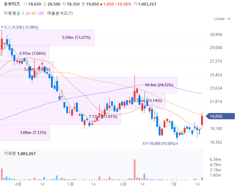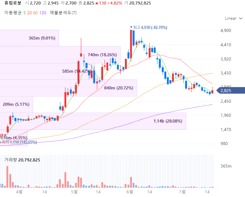 안녕하세요. 오늘은 휴림로봇 유일로보틱스 로보티즈 스맥 유진로봇 등 로봇 관려주를 살펴보겠습니다. 최근 삼성전자가 차세대 통신·전장·로봇·서비스 등 미래 신사업에 앞으로 5년 동안 450조 원을 투자할 계획을 밝히는 등 이외에도 LG,현대차 등 대기업들이 자사에서 로봇 사업을 강화하는 분위기 속에서 배달의 민족이 인천공항에서 배달로봇 서비스 시범 운영 소식에 국내 로봇 관련주가 강세입니다.
