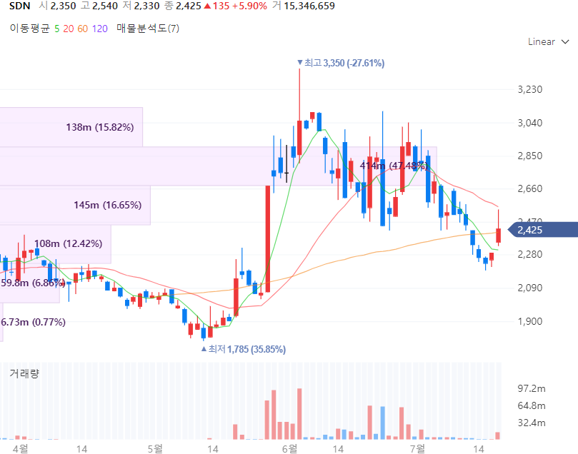 SDN은 태양광모듈 생산 전문 업체로 태양광 발전시스템, 태양전지판, 인버터 등을 공급합니다. SDN은 최근 최근 장당 출력이 550W이고 효율이 국내 최고 수준인 21.28%의 양면유리수광형 태양광모듈을 본격적으로 생산하기 시작했으며 작년9월 불가리아 태양광발전소 지분일부를 매각한 자금을 활용해 광주공장에서 최첨단 모듈 제조설비라인 구축을 시작했습니다. 아울러 새만금 수상 태양광 1단계 사업이 오는 9월 착공에 들어갈 전망되며 부각받습니다.