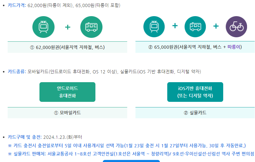 - 이용범위: 서울지역 지하철, 서울시 면허 시내·마을버스, 따릉이