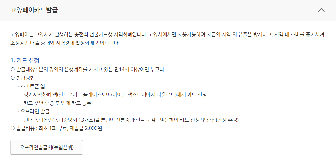 둘째, 관내 농협을 방문하여 고양페이카드를 신청하고 충전하기.