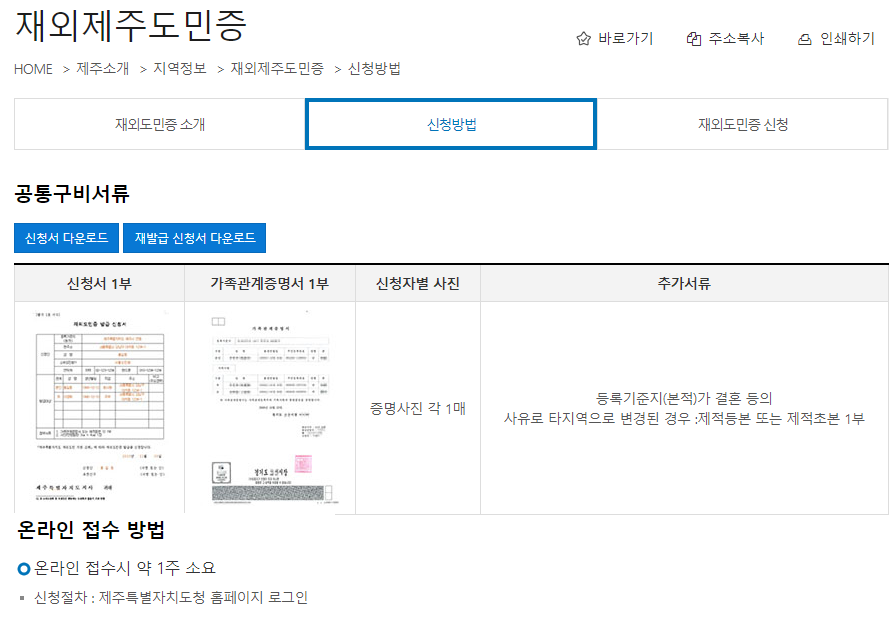 온라인으로 재외제주도민증 발급을 위해서 준비해야 하는 서류는 다음과 같습니다.