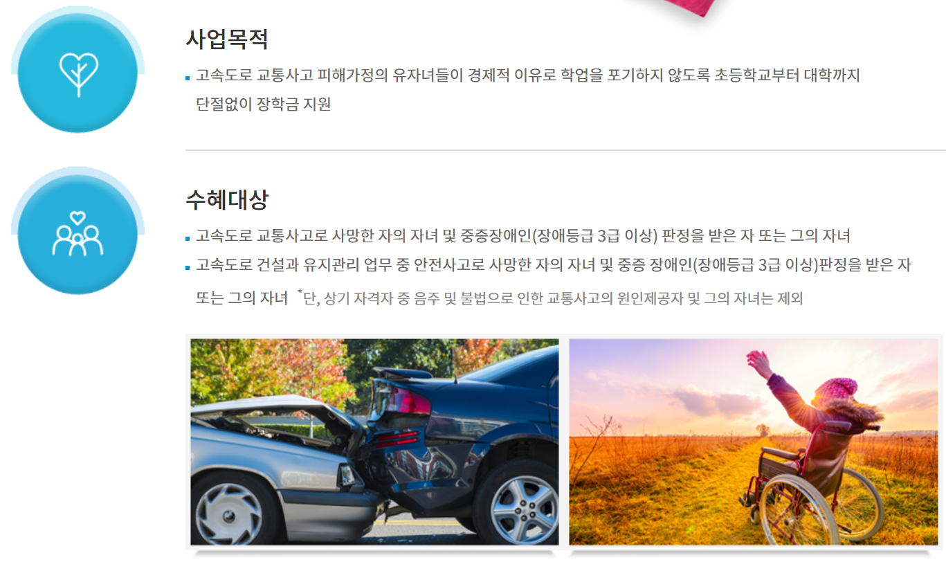 한국도로공사와 고속도로 장학재단에서 고속도로에서 불의의 사고를 당한 유족들에게 제공하는 장학금이 있습니다.