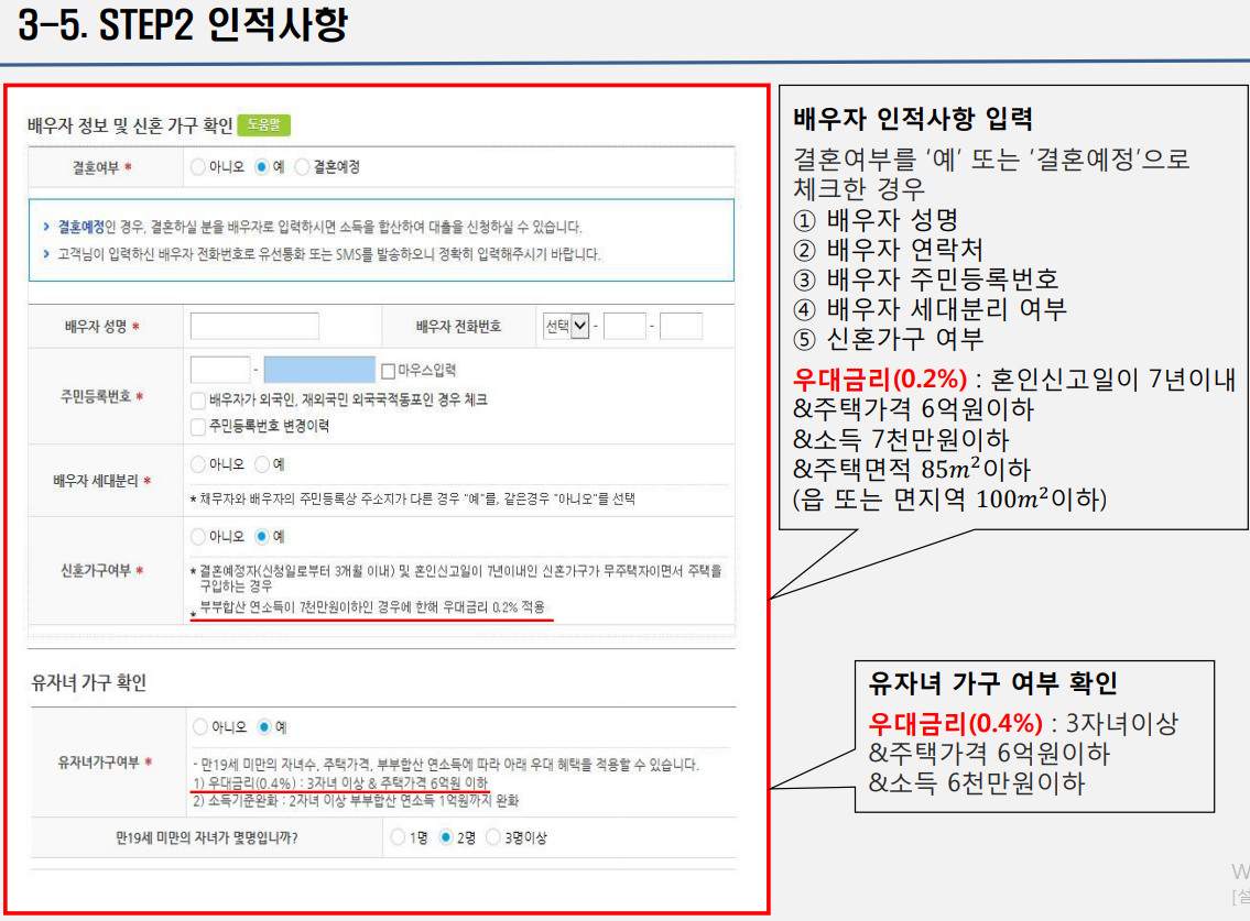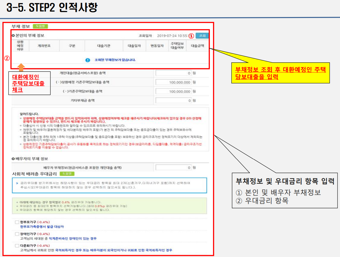 부채 정보 및 우대금리 항목 확인 앞서 살펴보았듯이 해당되는 사회적 배려층이라면 우대금리 부분도 확인해서 체크합니다.