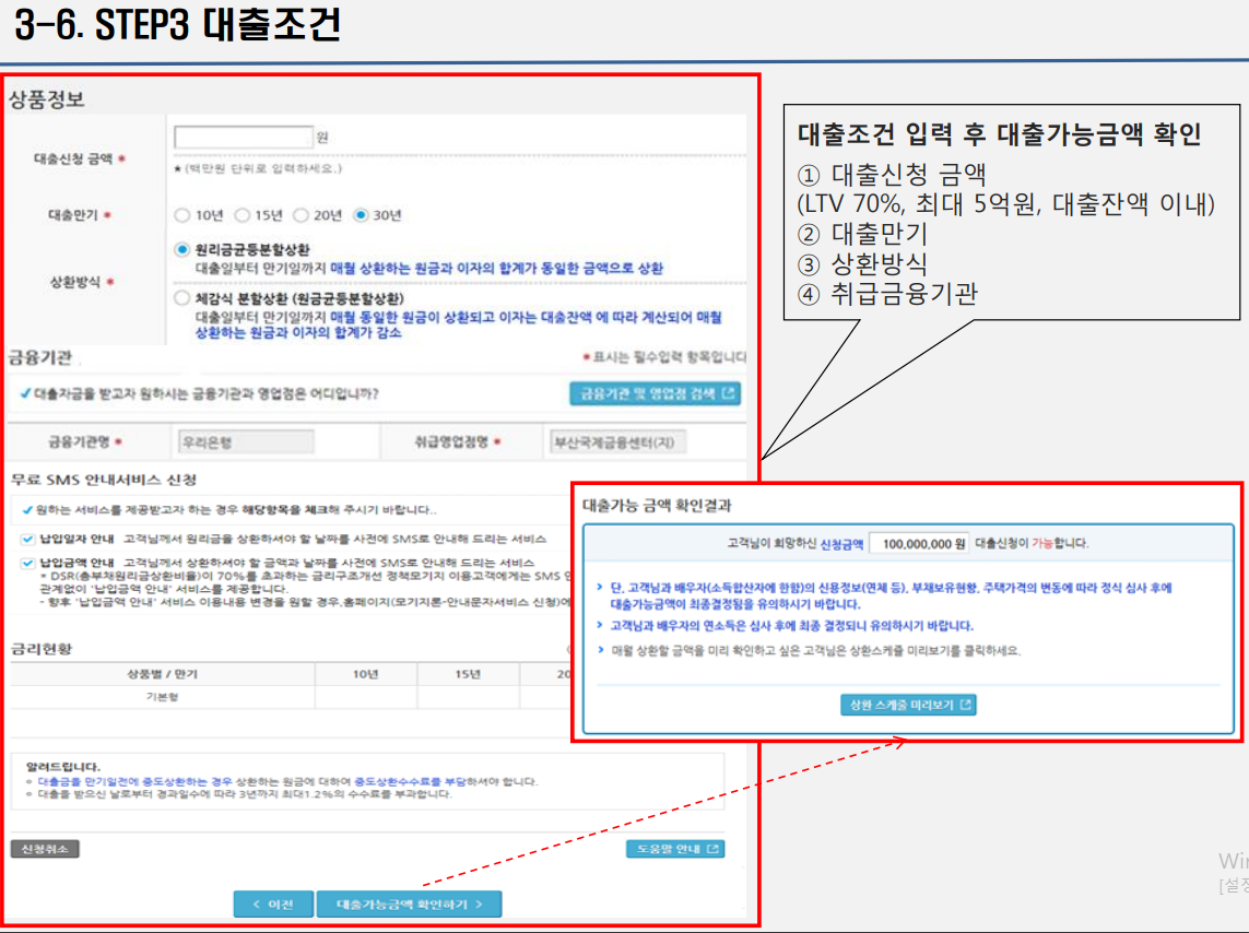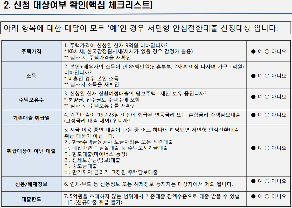 주택가격, 소득, 주택보유수, 기존대출 취급일, 대출한도 등을 읽고 모두 예가나와야 내가 서민형 안심대출 전환 대상자라는 것이 정확하게 판단됩니다.