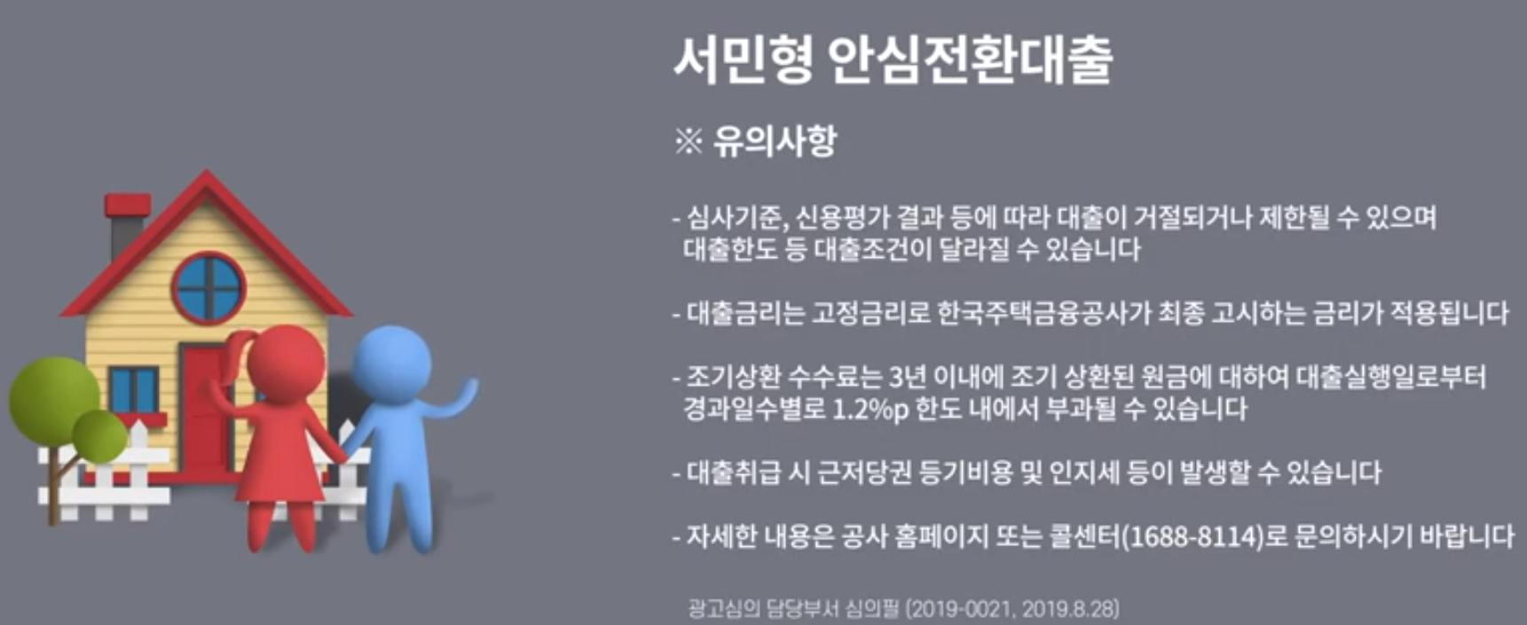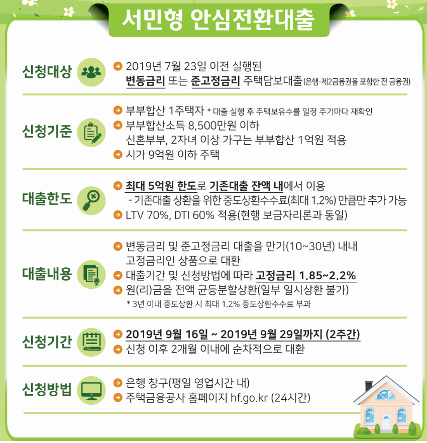 서민형 안심전환대출 리플렛 서민형 안심전환대출은 신청대상자는 우선 2019년 7월 23일 이전에 시행된 변동금리 또는 준고정금리 주택담보대출자만 신청할 수 가 있습니다.