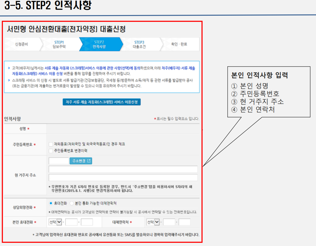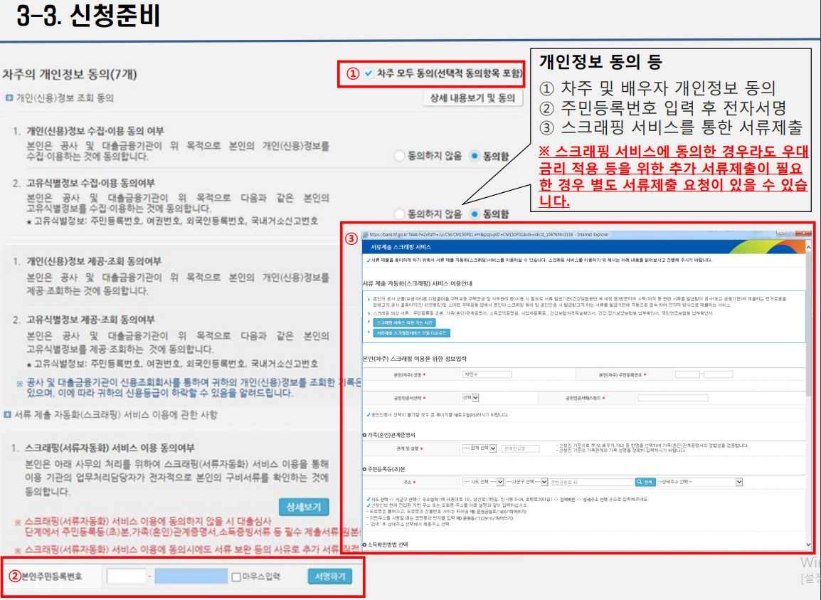 스크래핑 서비스 제출서류 간소화 온라인 신청시 전자약정에 서명하고 스크래핑 동의를 하면 우대 금리 적용을 위한 서류를 제외하고는 안심전환대출 제출서류가 간소화 됩니다.