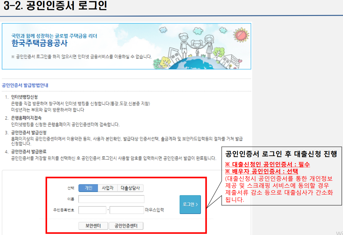 공인인증서 로그인 공인인증서 로그인 시 대출을 신청하는 본인의 인증서를 활용해야합니다.