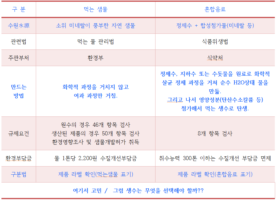 먹는 샘물과 혼함으료 차이 먹는 샘물은 혼합음료보다 까다로운 절차를 환경부 주관아래 거쳐 만들어집니다.