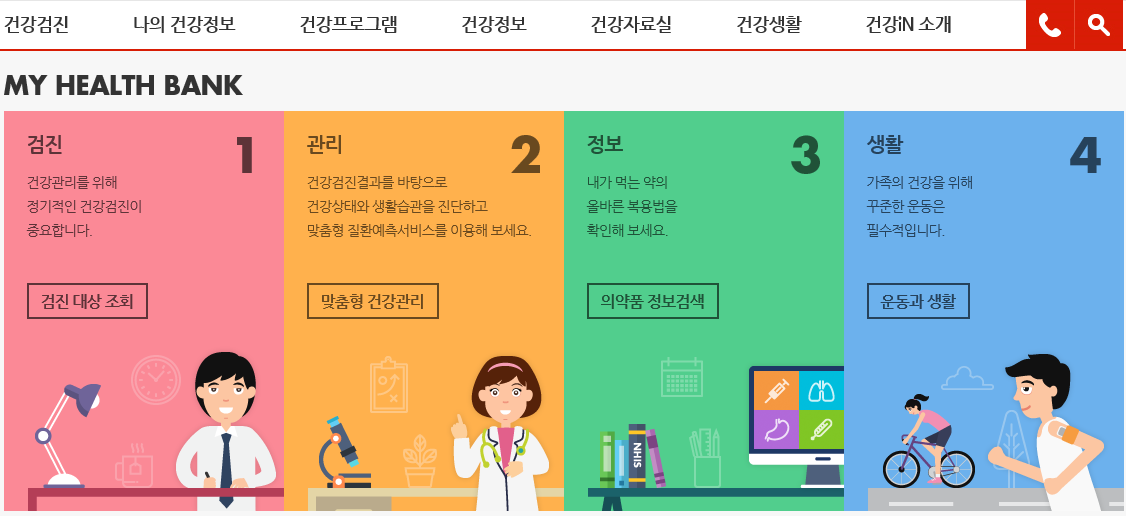 건강인 홈페이지에 들어가면 검진, 건강관리, 운동 정보 등을 한눈에 살펴볼 수가 있습니다.