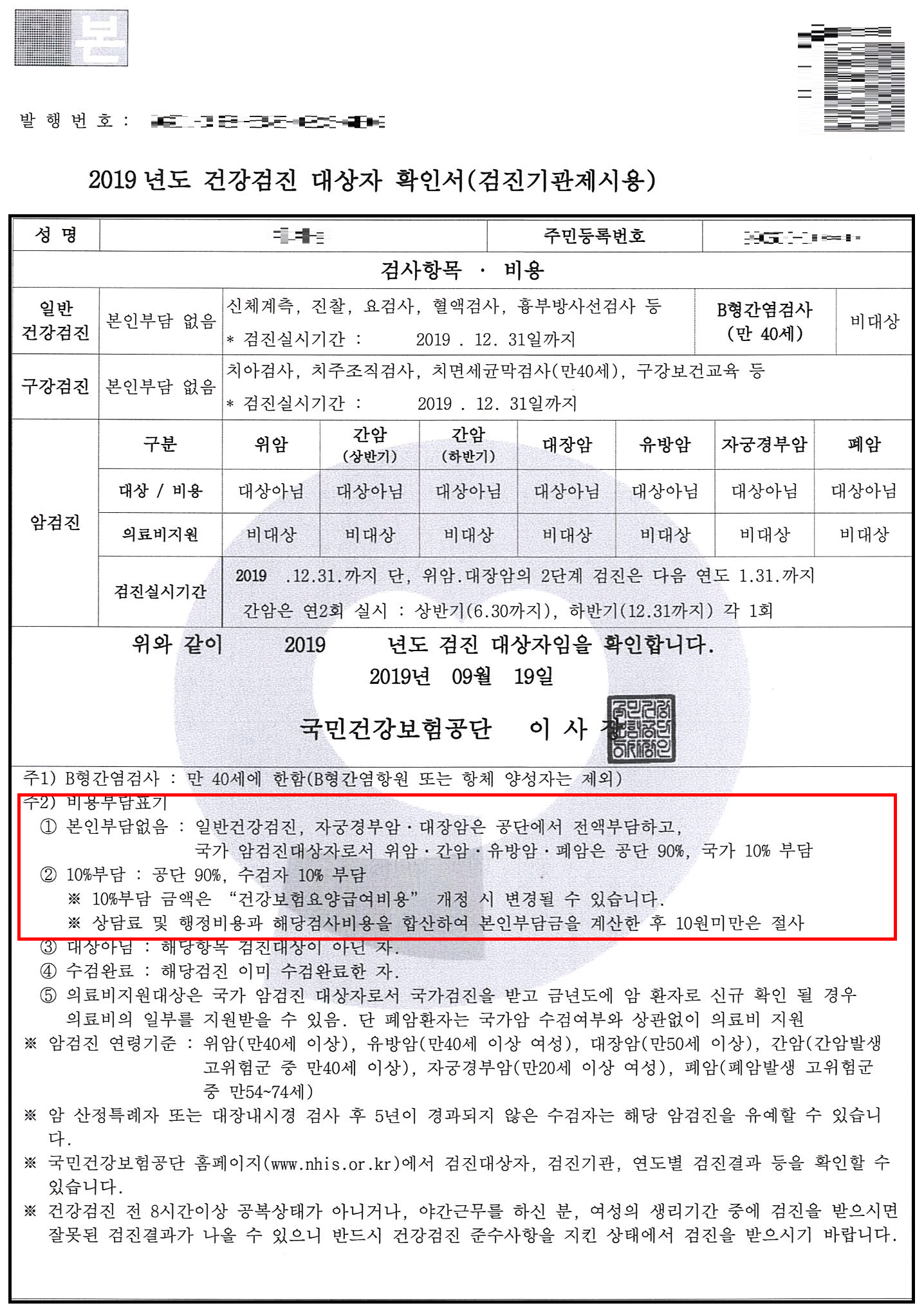 특히 일반 건강검진 항목을 보면 따로 본인부담비용은 없으며 암 검진에서만 건강보험공단 90% 부담, 자부담 10%가 있을 뿐입니다.