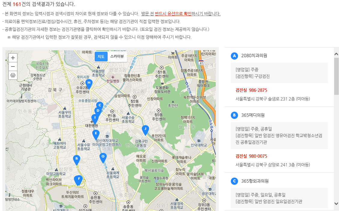 예를 들어 서울 강북구를 중심으로 건강검진이 이루어지는 곳을 찾아보면 아래와 같이 나옵니다.