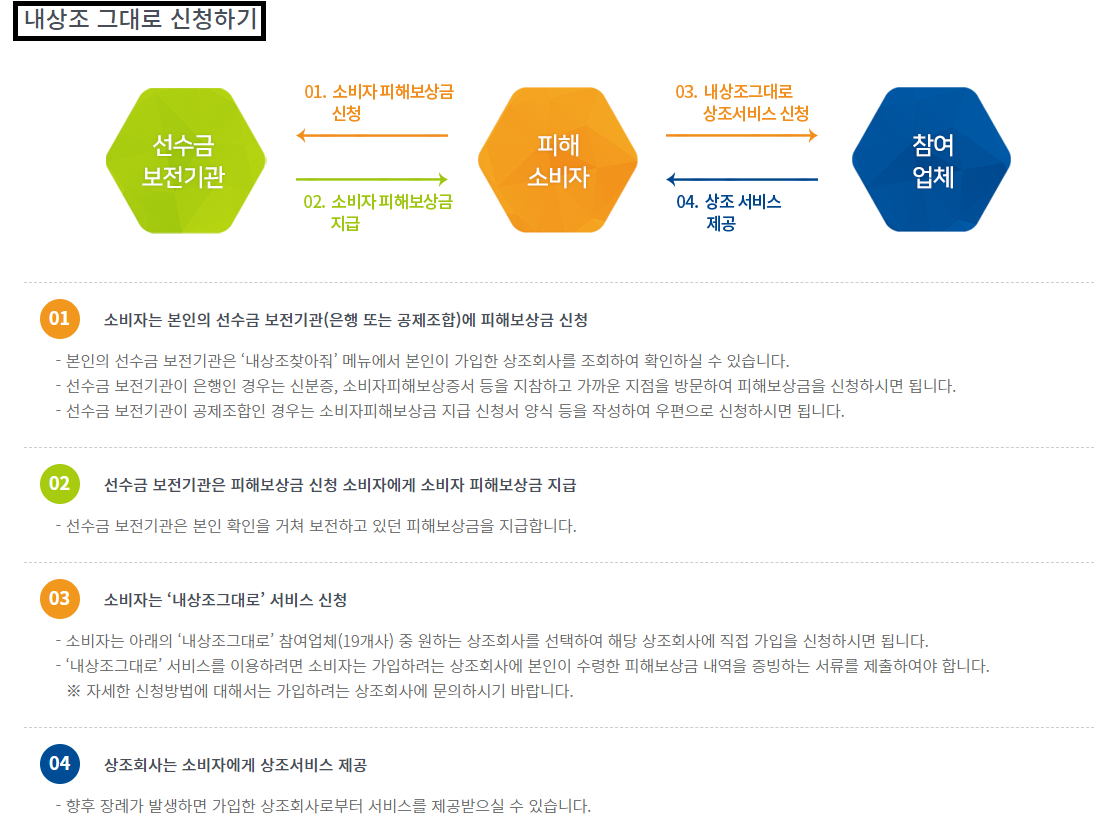 내상조 그대로 서비스는 상조회사의 폐업 및 등록취소 등으로 선수금 보전기관에서 피해보상금을 수령한 소비자가 공정거래위원회에서 선정한 상조회사를 통해서 추가 부담없이 상조서비스를 계속 이용할 수 있도록 보장하는 제도입니다.