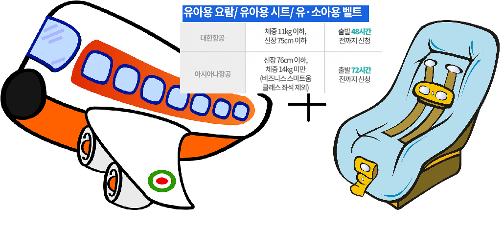 아시아나항공의 경우 신장은 75cm, 체중은 14kg까지 이용할 수 있고, 출발 3일 전까지 신청해야 합니다.