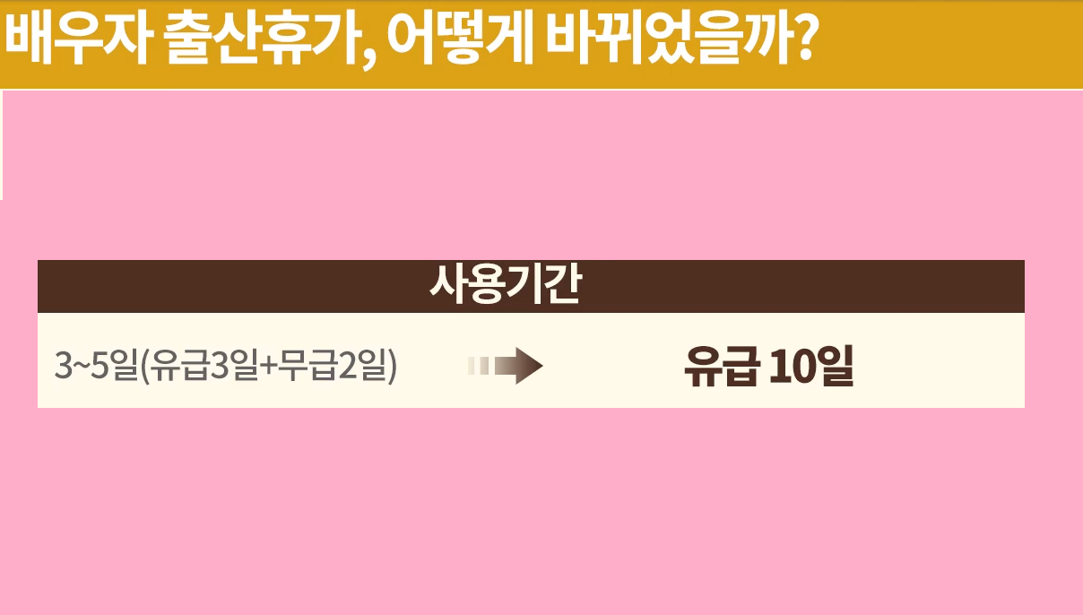 첫째, 기존 배우자 출산휴가 일수는 최대 5일이며 그중 3일만 유급, 나머지 2일은 무급휴가였습니다.