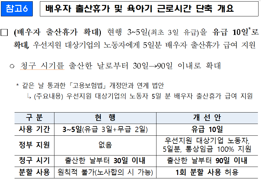 가정의 출산과 육아 참여를 장려하기 위해 배우자 출산휴가 기간이 대폭 늘어났습니다.