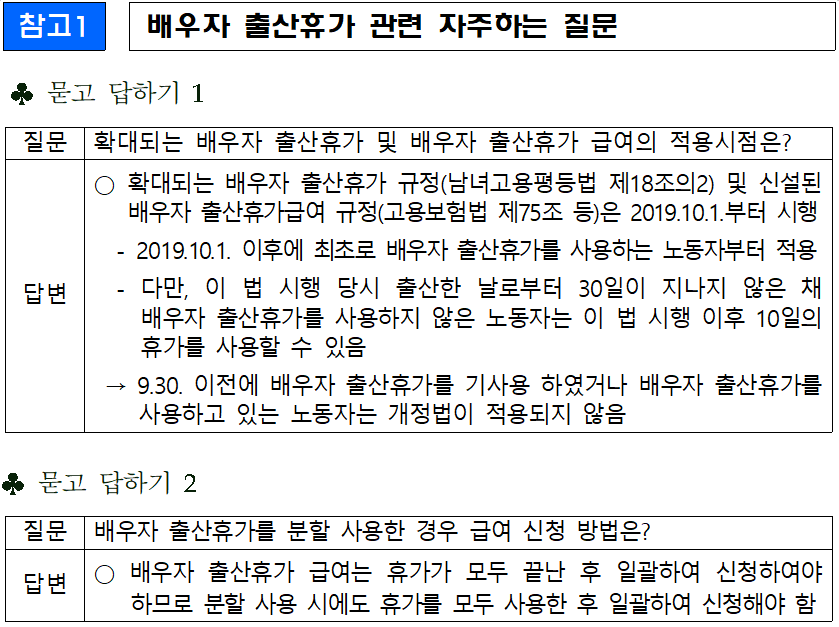 다음으로 배우자 출산휴가에 대해 자주 하는 질문을 살펴보면 아래와 같습니다.