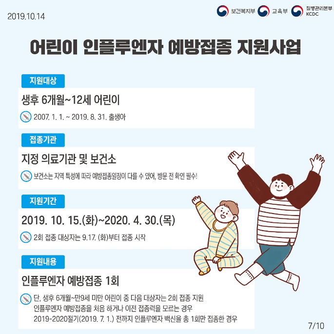독감 예방접종 무료대상자 중 어린이는 2007년 1월 1일~ 2019년 8월 31일 출생아를 의미합니다.