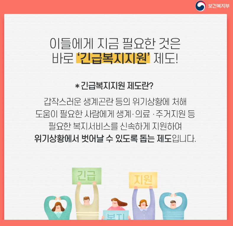 그 중 긴급복지지원제도는 말 그대로 정말 도움이 필요한 가정과 국민에게 복지 응급서비스입니다.