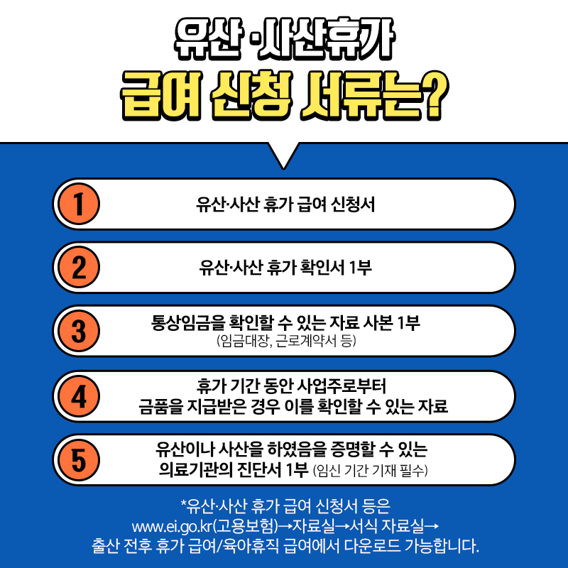 아빠넷, 고용노동부 유산 및 사산휴가 급여신청을 하는데 필요한 서류는 다음과 같습니다.