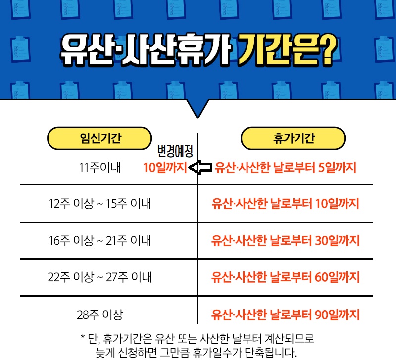 1) 임신기간 11주 이내 : 휴가기간 5일 (앞으로 10일로 변경예정, 입법예고)
