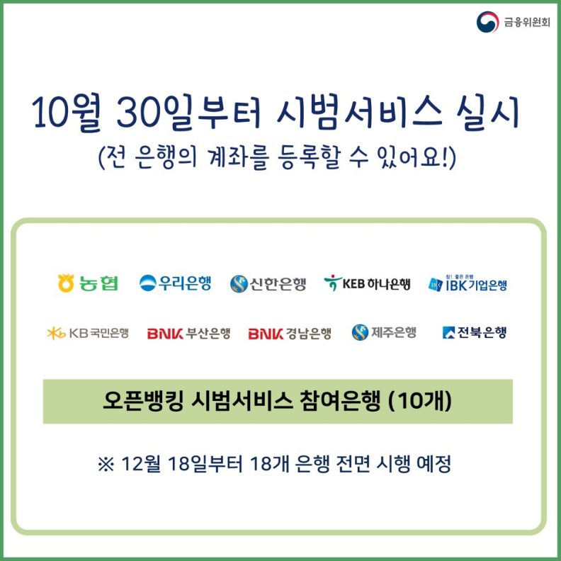 2019년 10월 30일부터 시범으로 오픈뱅킹 서비스에 참여한 은행은 농협, 우리은행, 신한은행, KEB하나은행, IBK기업은행, KB국민, 부산, 경남, 제주, 전북은행 총 10곳입니다.
