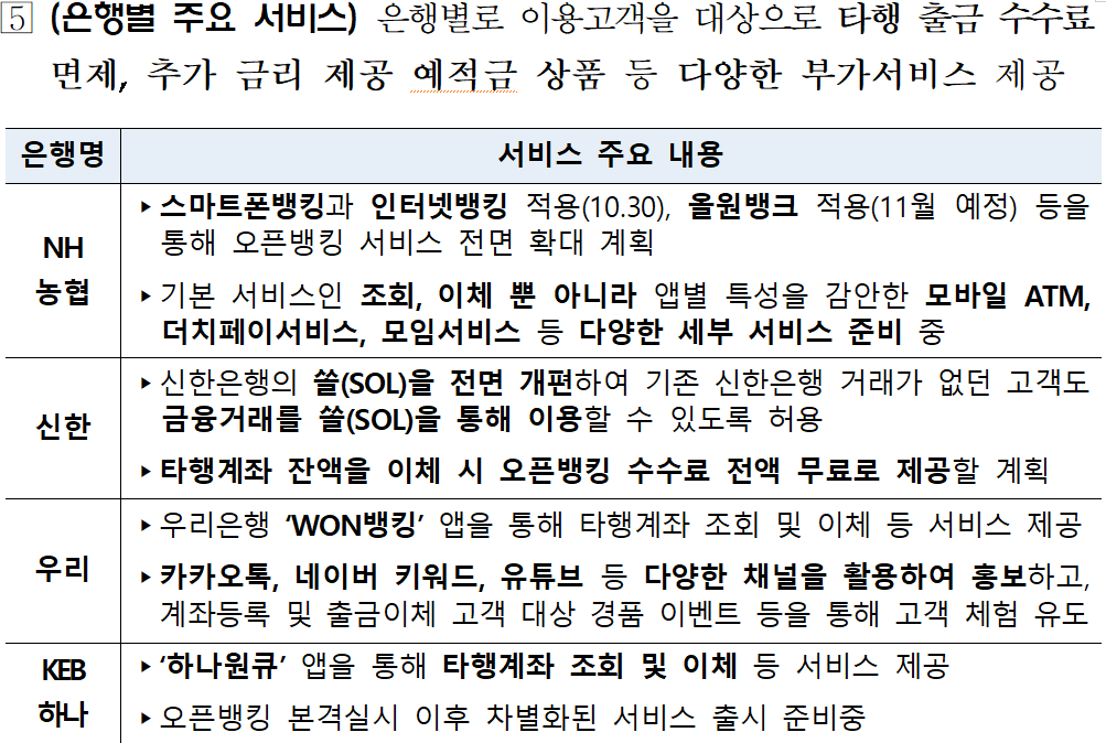 이를 더 자세히 살펴보면 오픈뱅킹 실시에 따른 은행별 혜택이 있습니다.