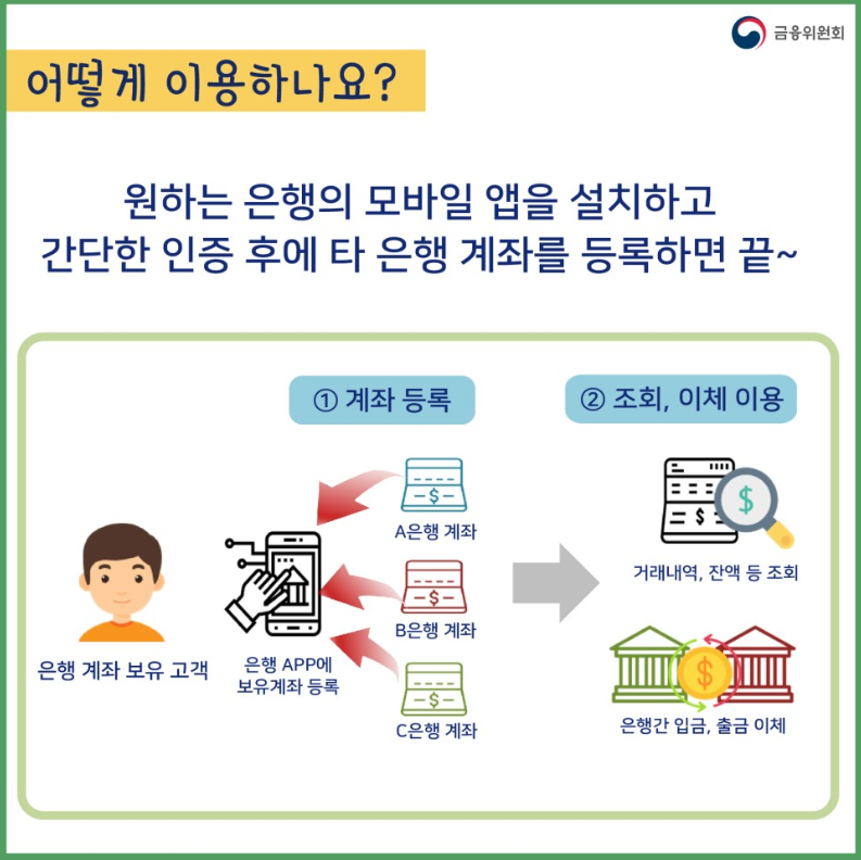 간단히 말해, 내가 이용하는 하나의 은행이나 핀테크 업체에서 다른 은행으로 쉽게 이체, 송금, 조회 등을 할 수 있도록 바뀝니다.