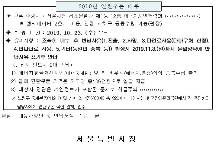서울시청 홈페이지 연탄쿠폰 배부 공문 예를 들면, 서울시에서도 연탄쿠폰이 배부되고 있습니다.
