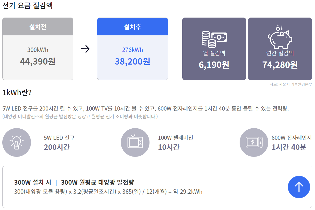 태양광 설치로 인해서 전기세가 월 6천 원, 연간 7만 4천 원 절약됩니다.