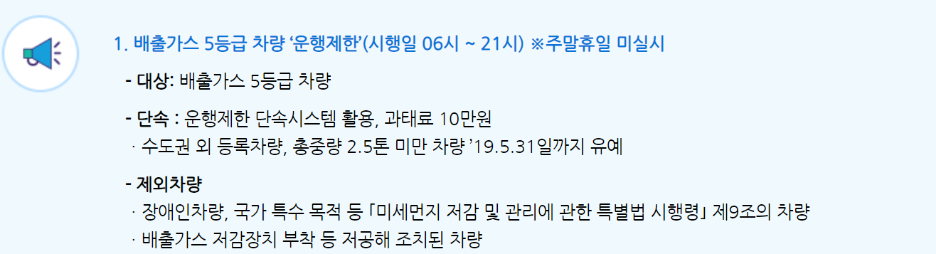 배출가스 등급제에 의해 5등급 차량은 운행시 과태료를 10~25만 원까지 내도록 바뀌었습니다.