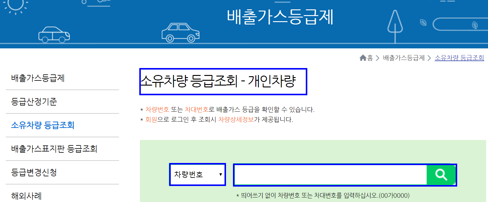 차량번호 또는 차대번호를 입력하여 배출가스 등급을 확인할 수가 있습니다.