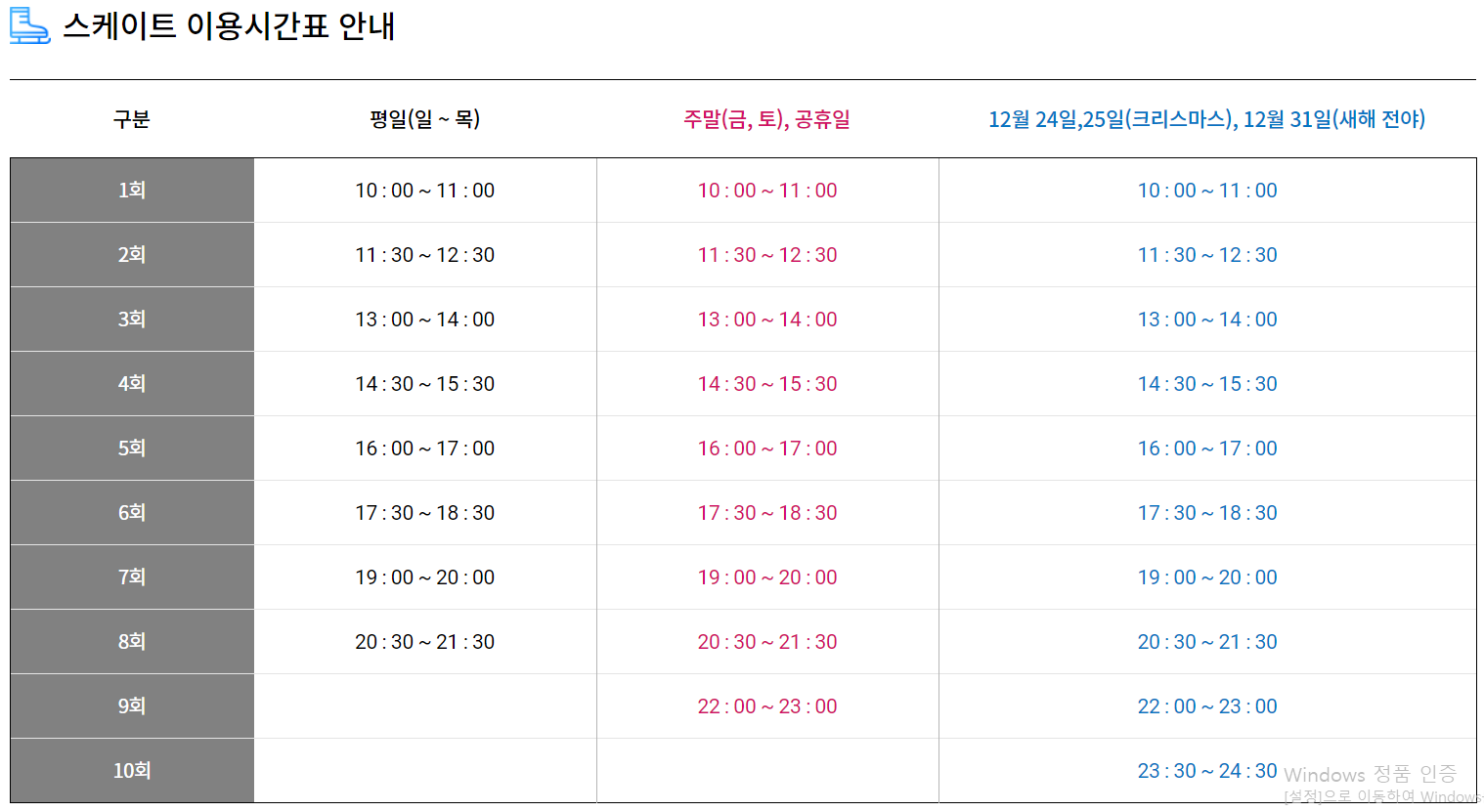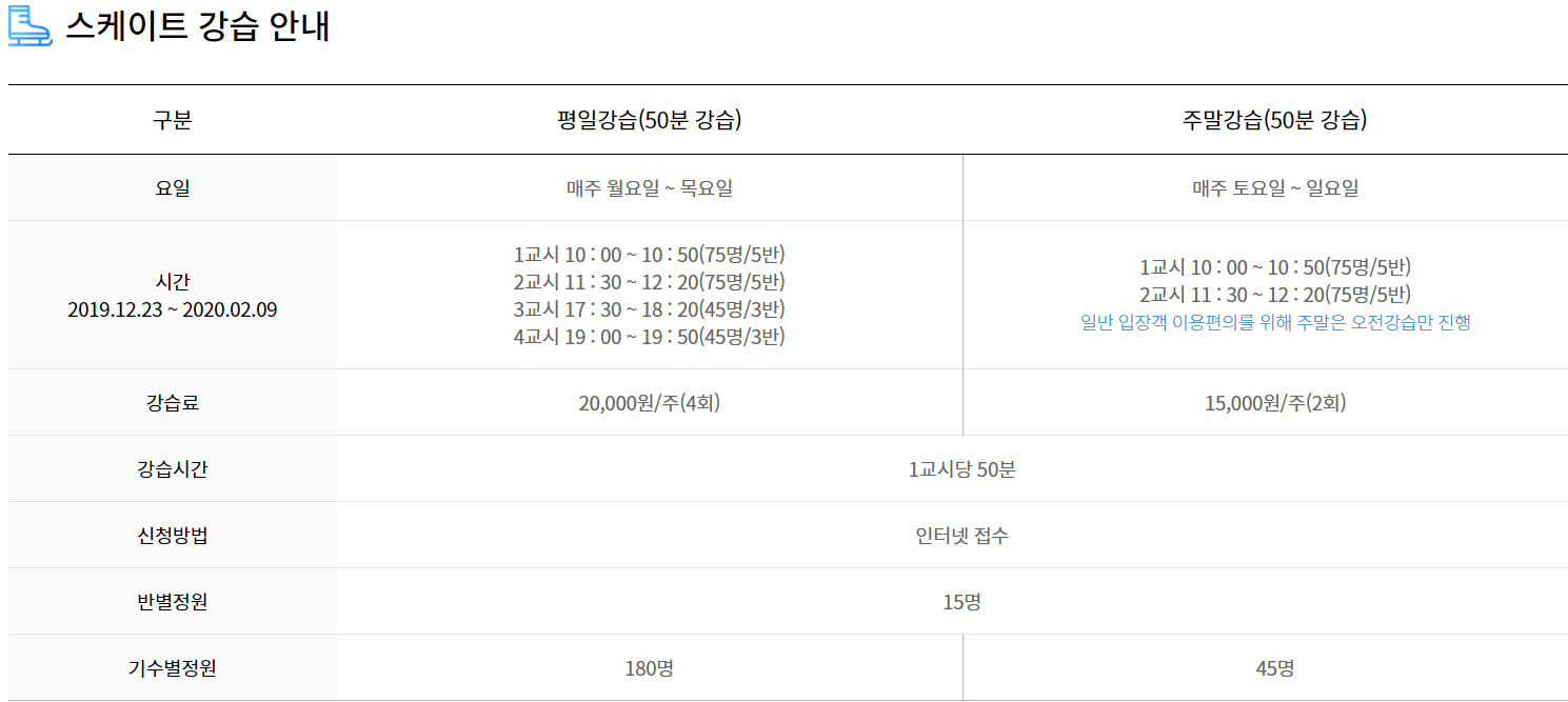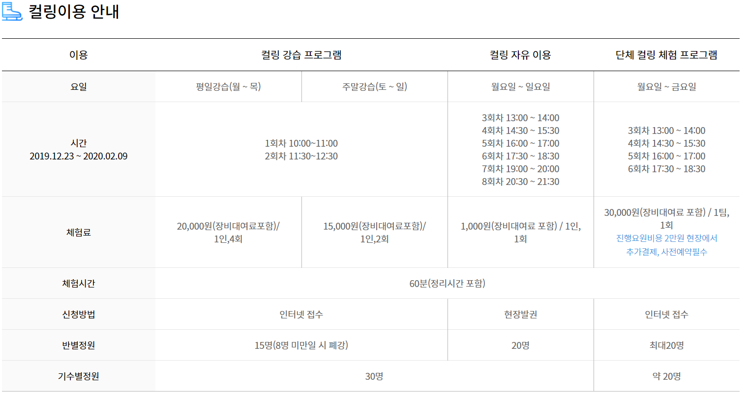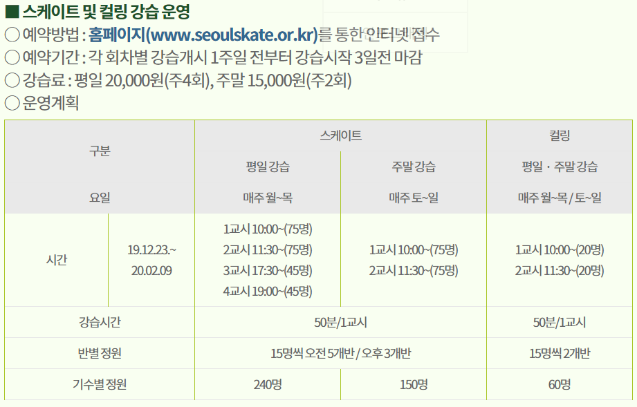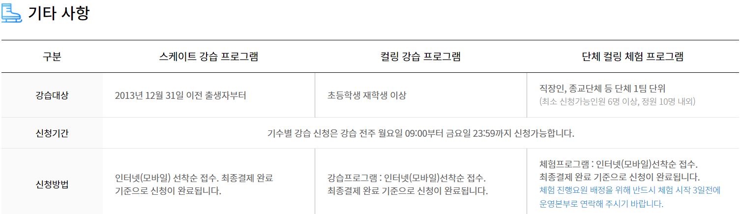 : 스케이트/커링 강습체험은 기수별 강습전 주 월요일 9시부터 금요일 23:59까지 가능하다고 하니