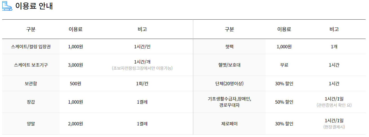 : 스케이트 장비 대여 및 헬멧, 보호대는 무료입니다.