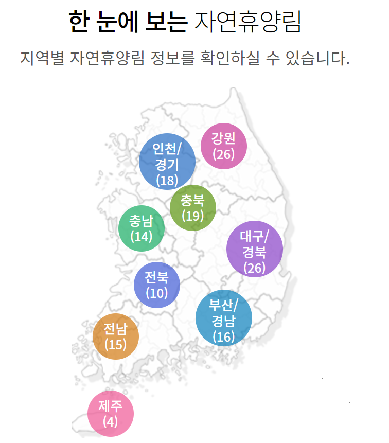 숲나들e 사이트에서 통합 예약은 물론 전국지도를 바탕으로 전국에 있는 자연휴양림은 물론