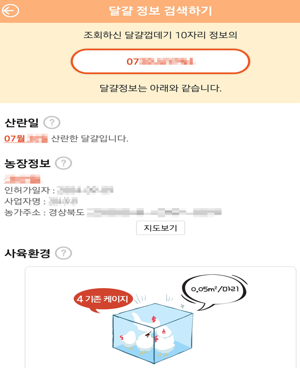 달걀 정보검색을 눌렀을 때 달걀 껍데기에 적힌 코드 10자리를 적어 조회할 수 있습니다.