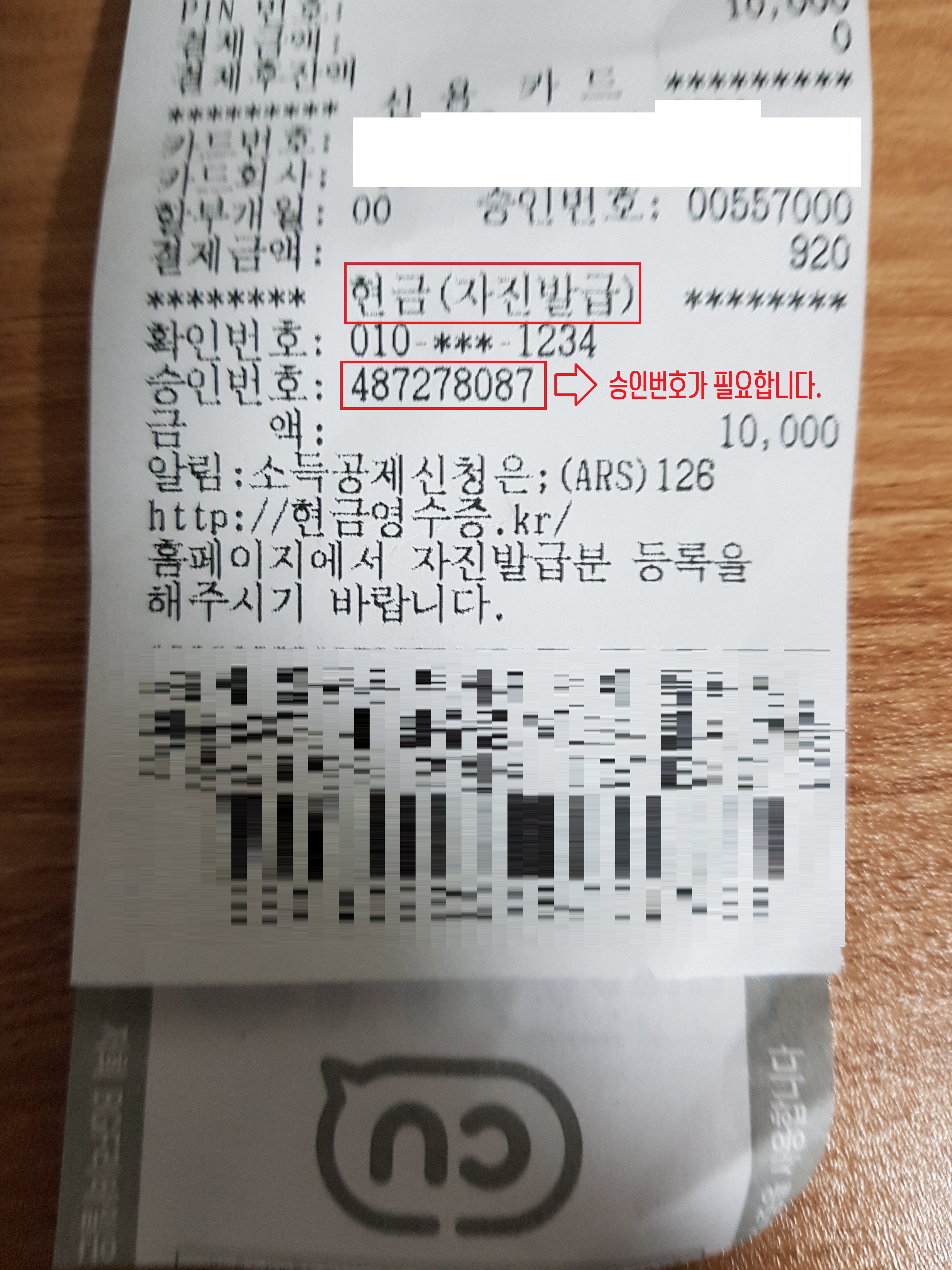 하지만 이러지 않을 경우 영수증을 살펴보면 현금영수증 자진발급 번호가 나와있습니다.