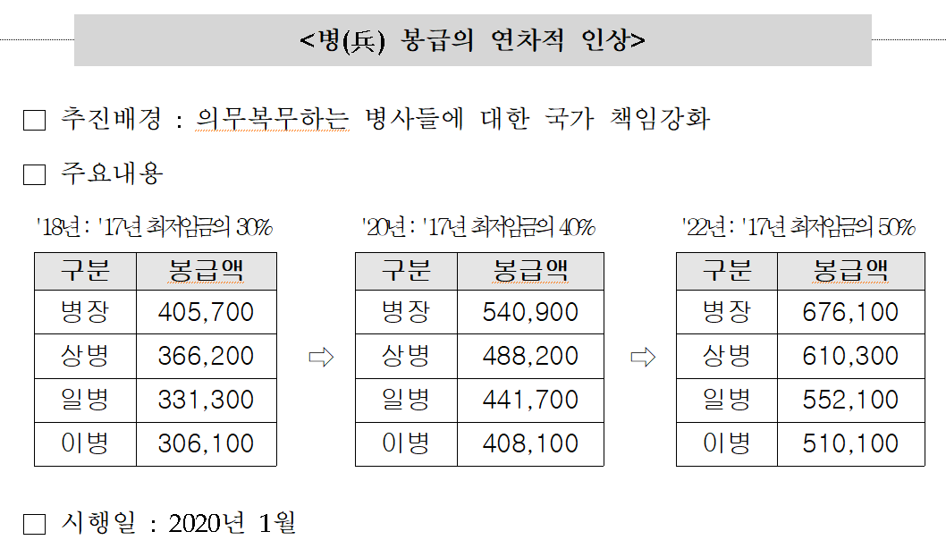 군인의 월급은 2019년 대비 33% 인상하여 지급이 될 예정입니다.