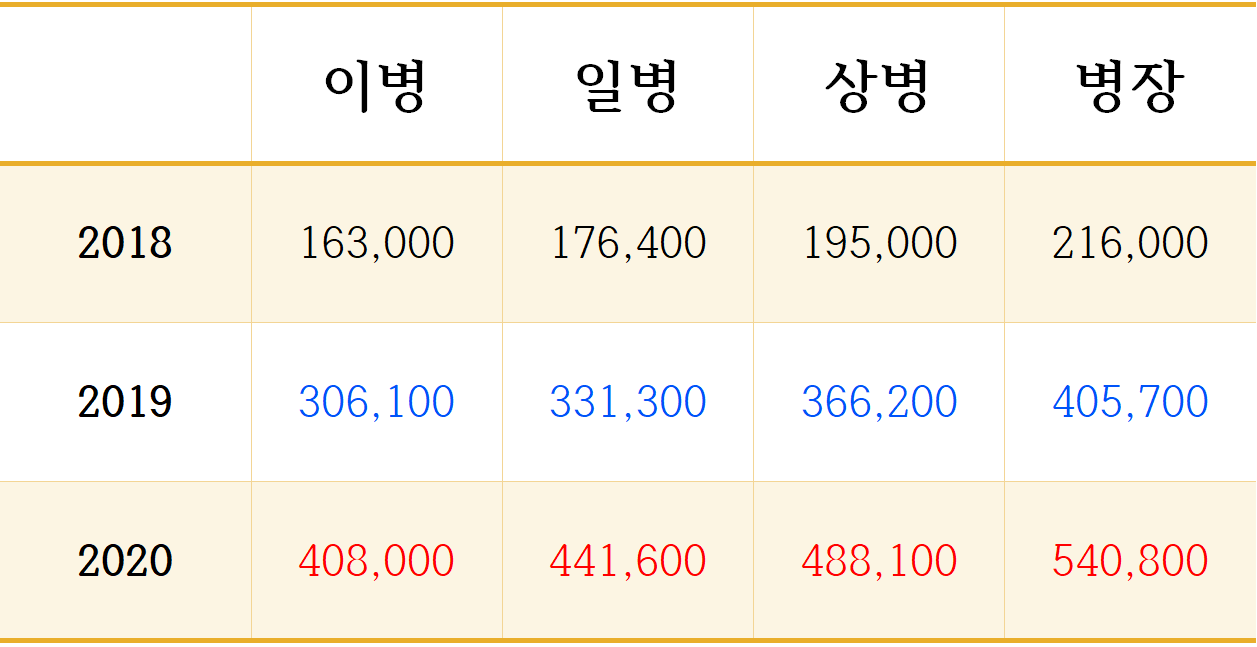 군인 월급이 불과 2년 전인 18년보다 약 2.5배 올랐다는 사실을 알 수 있습니다!