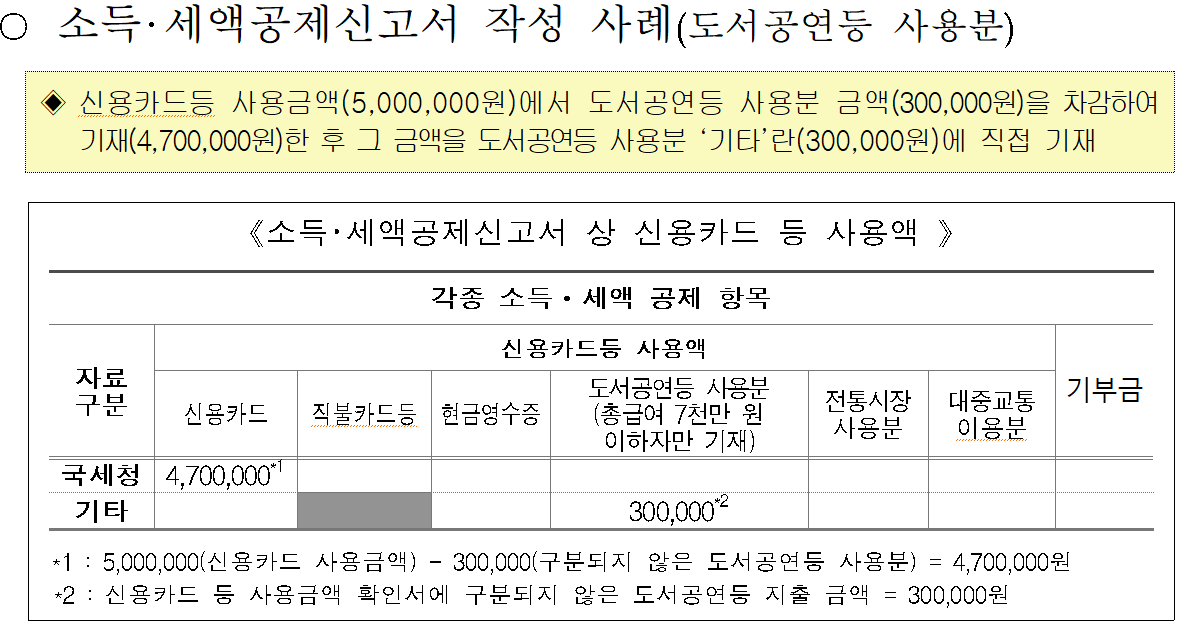 그럴 경우 예를 들어 카드 사용금액에서 도서 공연 등 사용분은 차감하여 작성한 후