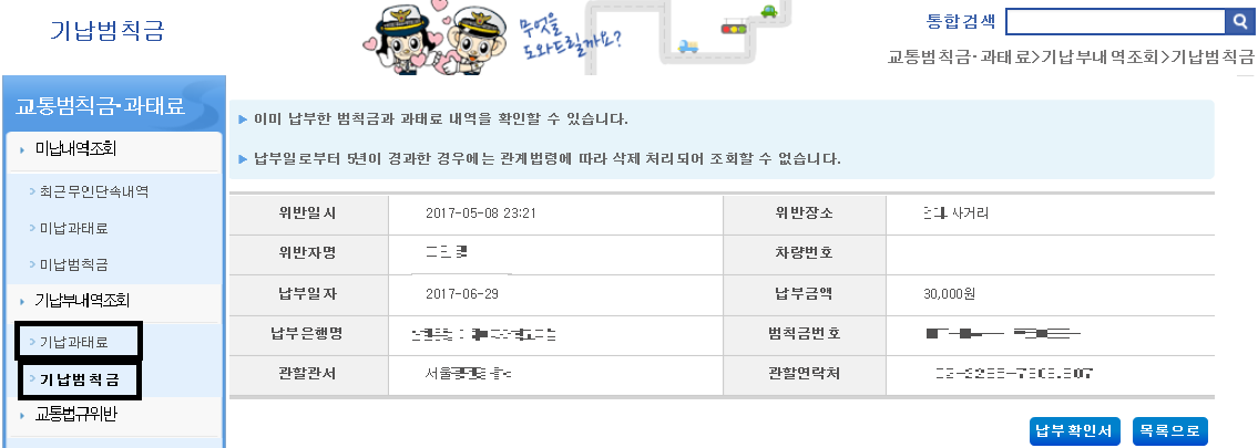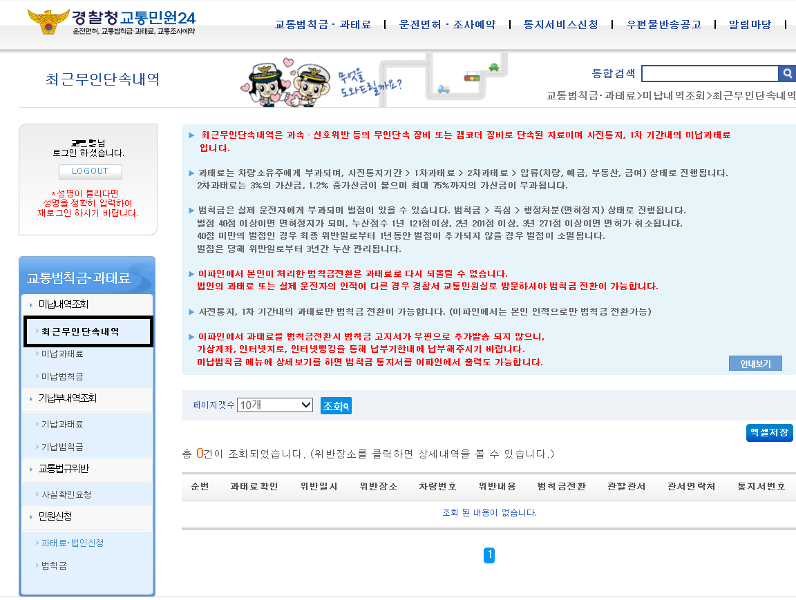 미납 과태료 및 기납범칙금 내역을 누르면 전에 교통 단속 내역을 볼 수 있습니다.