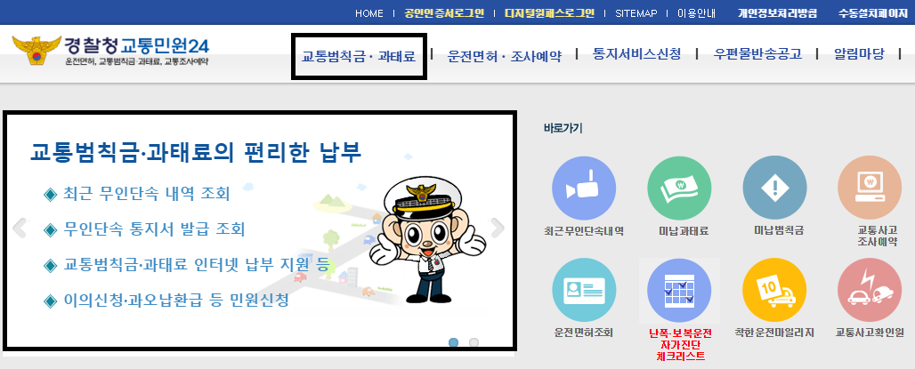 경찰청 이파인 메인 홈페이지 화면에 들어가면 교통범칙금 및 과태료 버튼이 보입니다.