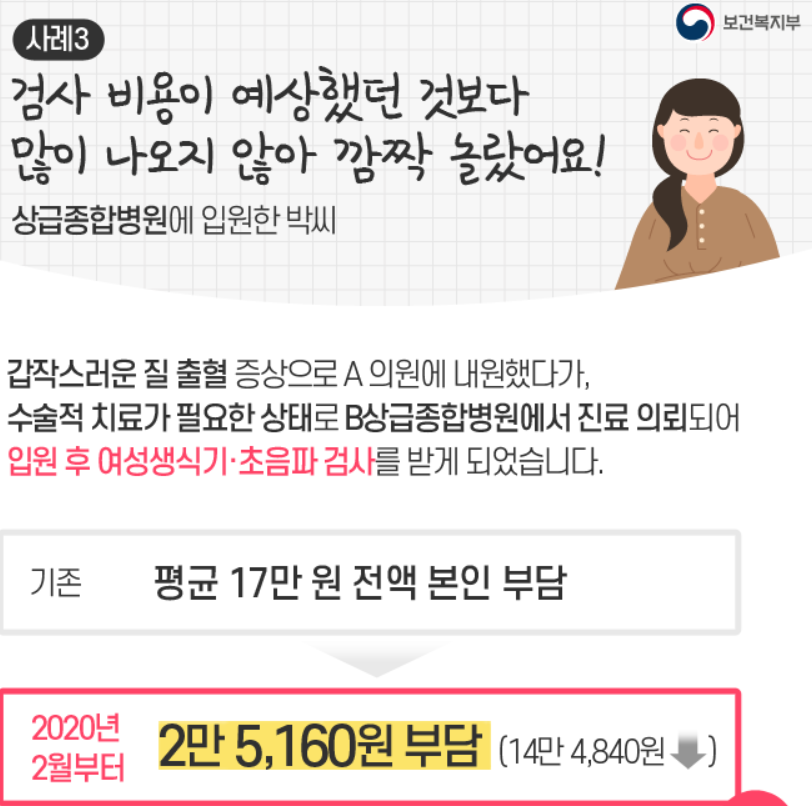 예를 들어, 자녀가 2차 성징 이후에도 초경을 하지 않아 여성 생식기 정밀 초음파 검사를 받았는데 기존에는 평균 17만 원을 부담했지만 2020년 2월부터는 7만 5400원만 지불하면 되는 것으로 바뀝니다.