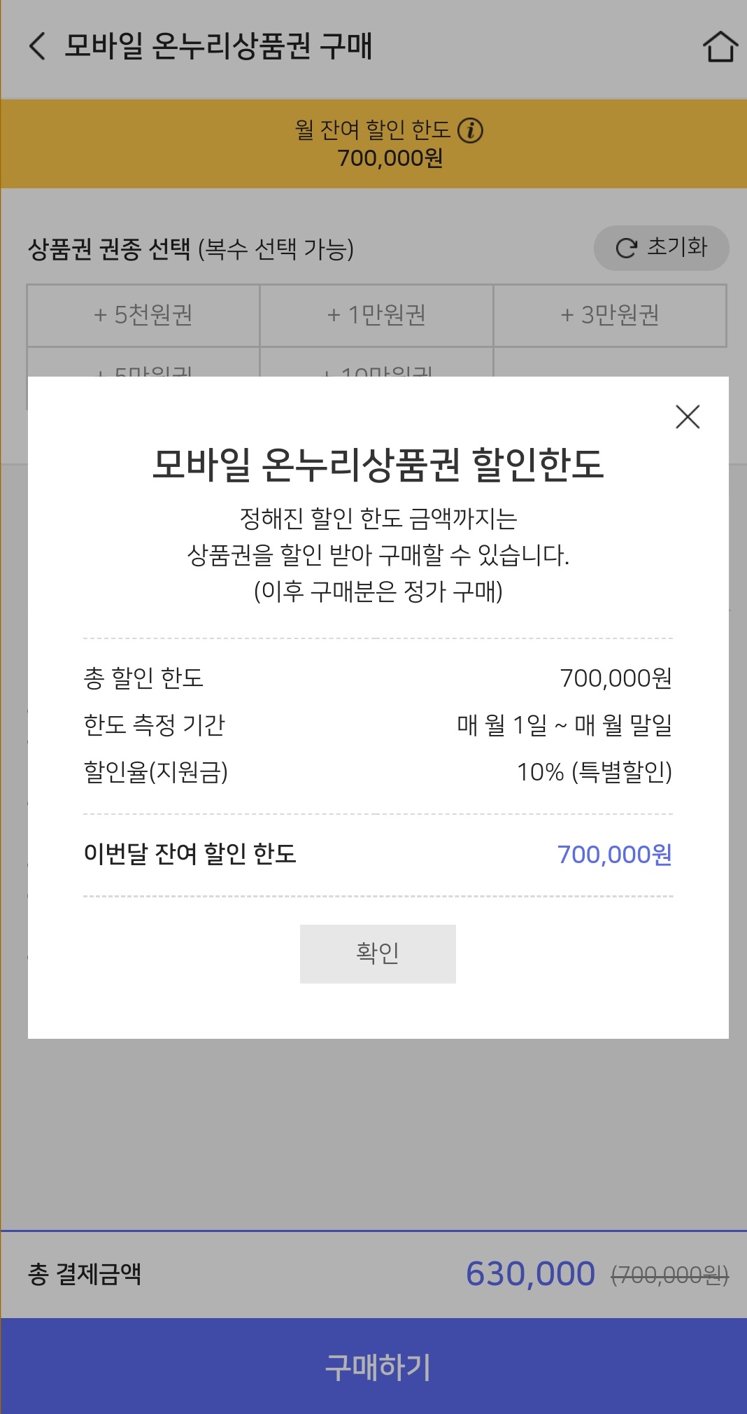 만약 70만 원어치 모바일 온누리상품권을 구매한다면