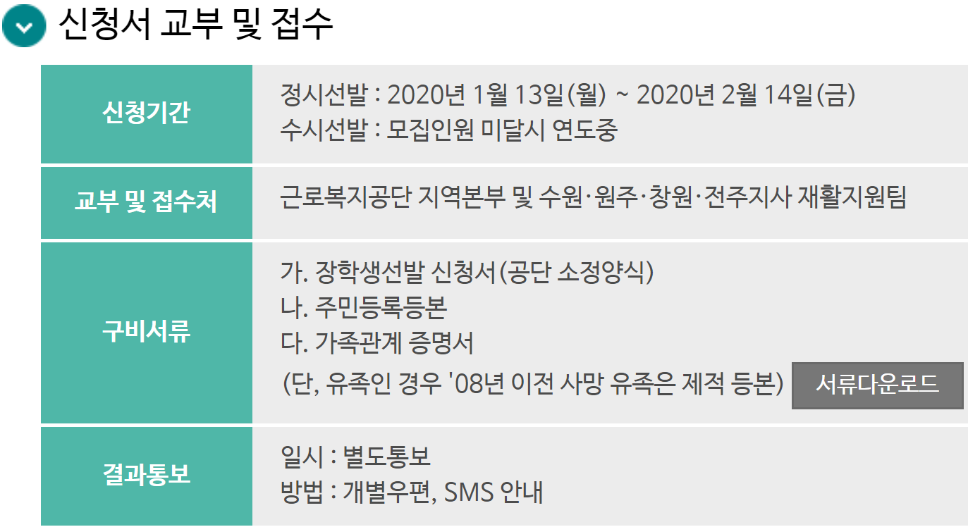 장학생 선발 양식은 근로복지공단에서 다운 이용할 수 있으며 서류가 누락되는 일이 없어야겠네요.