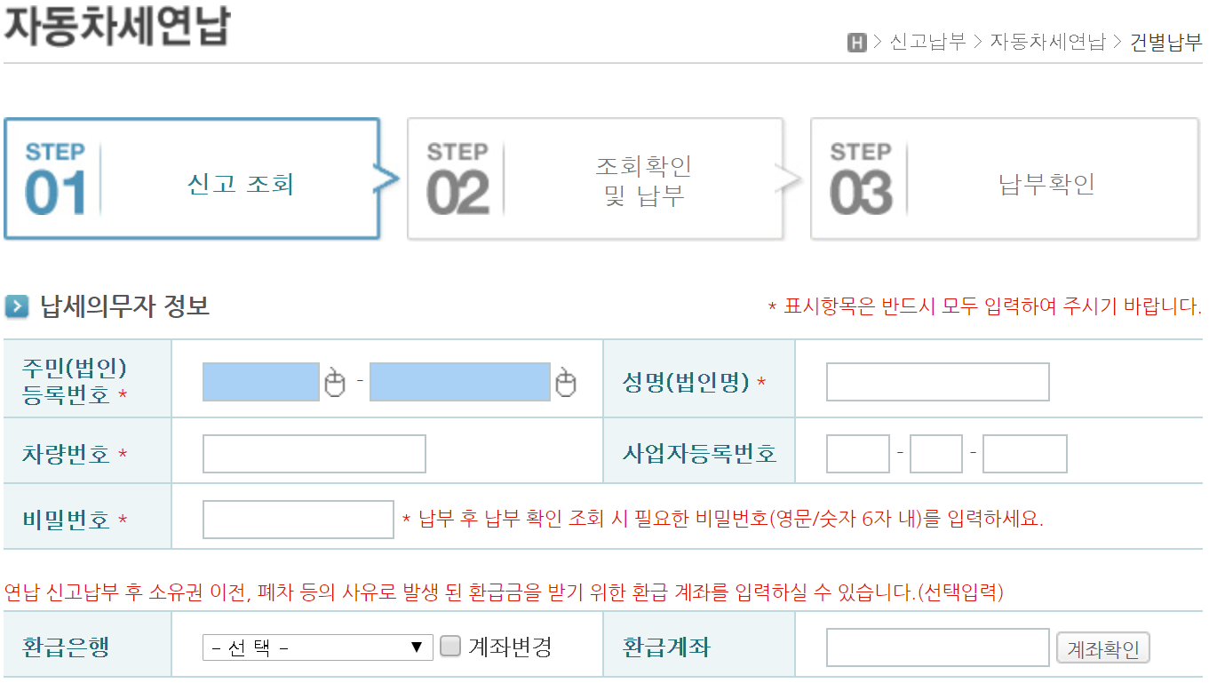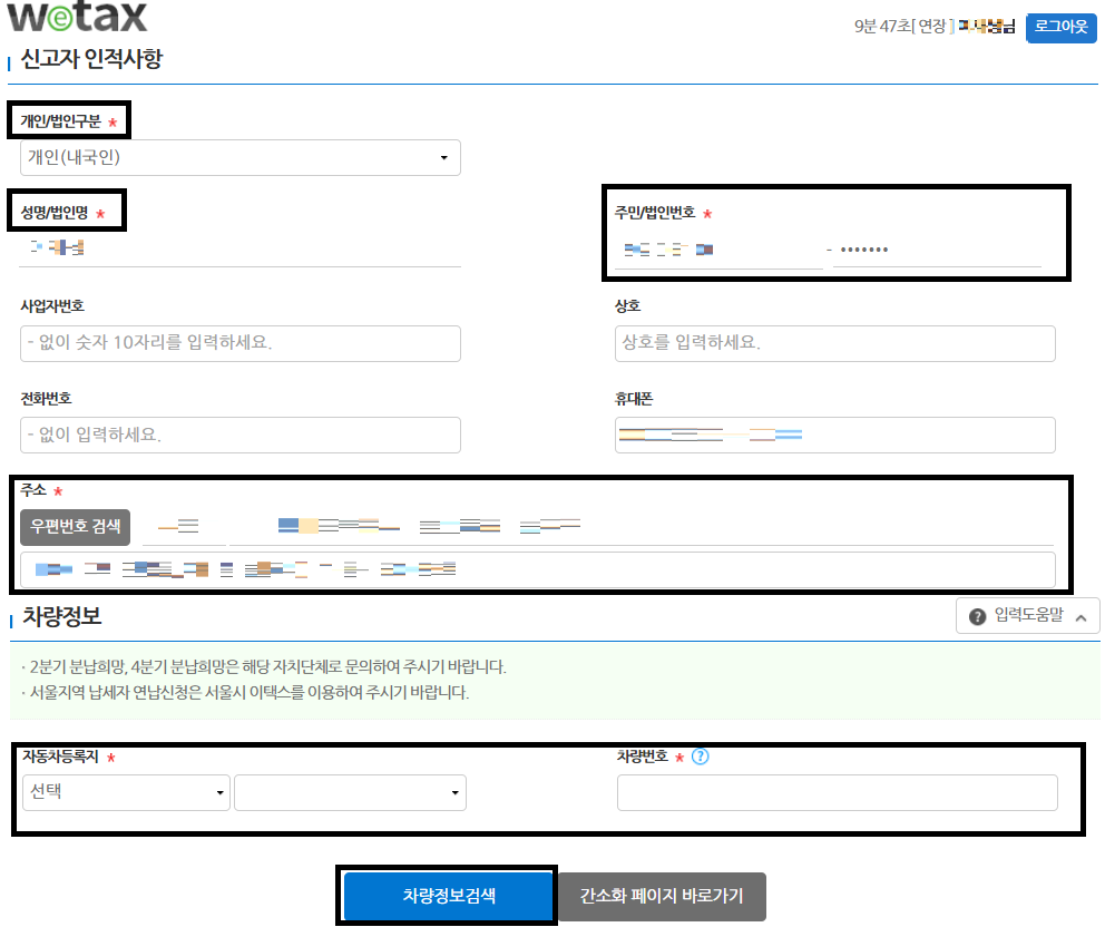 자동차세 연납신청 화면이 나오는데 여기서 차량 소유주의 개인정보를 작성해주고