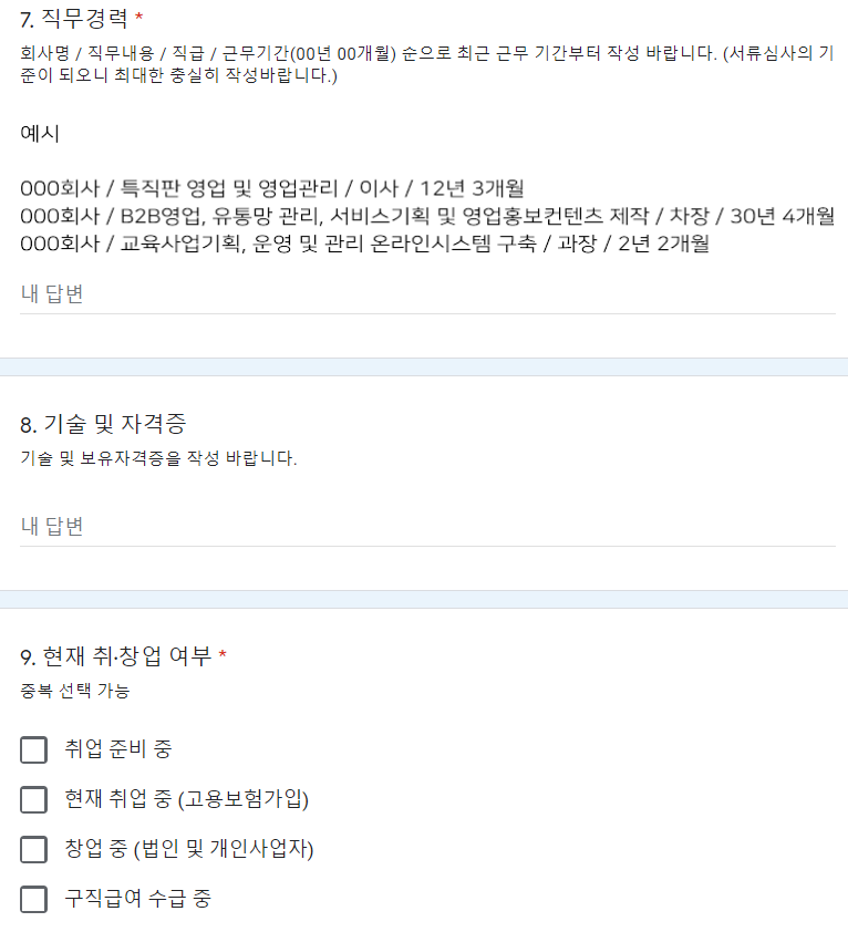 성명, 나이를 비롯하여 자신이 기존에 다니던 회사에서 맡은 일과 자격증, 기술능력