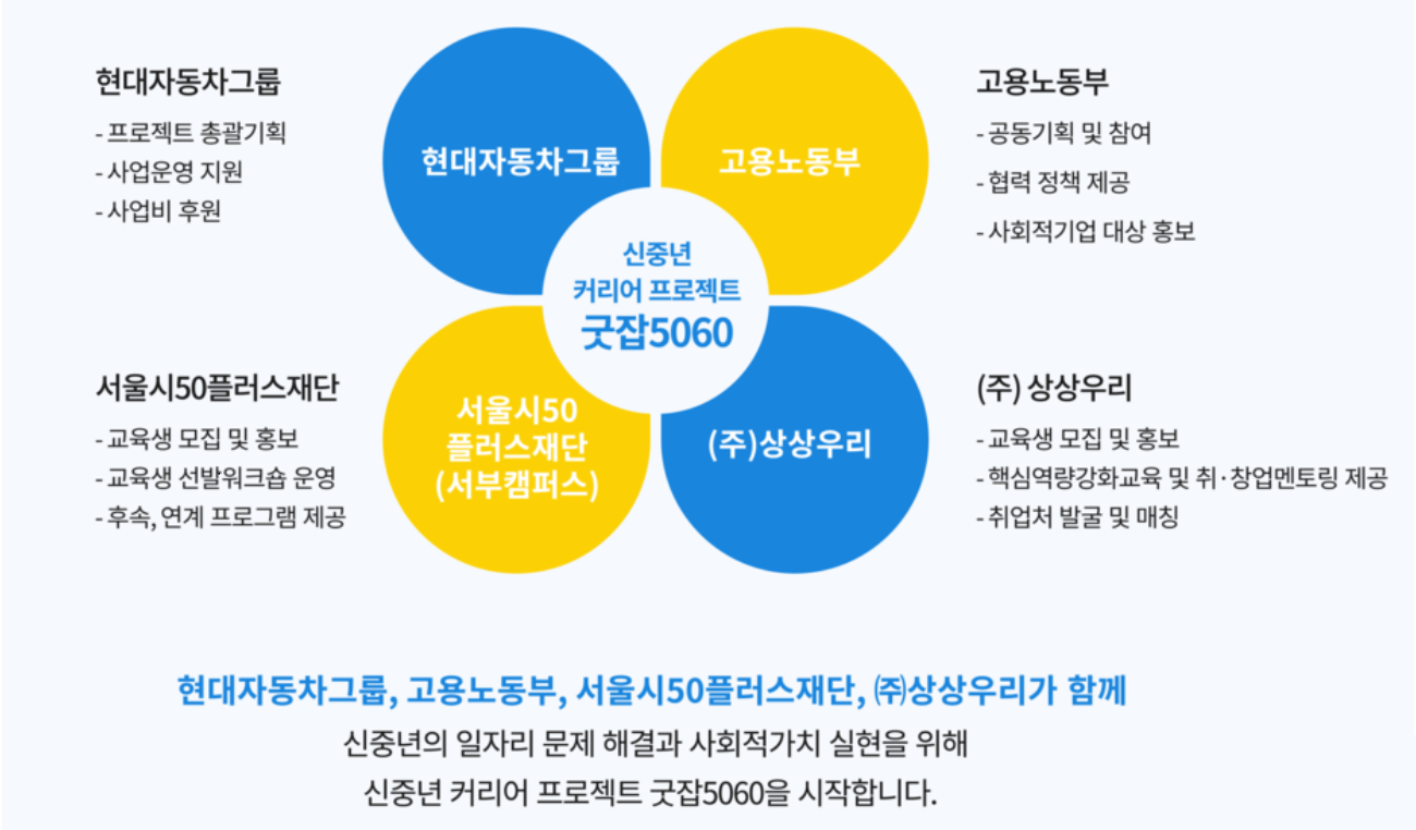 굿잡5060은 현대자동차그룹, 고용노동부, 서울시50플러스재단, ㈜상상우리가 함께